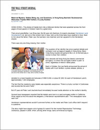 The photos of triplets born into a billionaire family that were splashed across the front pages of Hong Kong papers in October made for a great story. Their proud grandfather, Lee Shau-kee, the 82-year-old chairman of property developer Henderson Land Development Ltd. and one of the richest men in Asia, held up the three baby boys swathed in blue. Next to him stood the father, Peter Lee, the bachelor vice chairman and heir apparent to the Henderson empire. There was only one thing missing: their mother. The question of her identity sparked debate and confusion over surrogacy’s legality in Hong Kong. Many Hong Kong couples are going to the U.S. to find and pay women to bear their children.